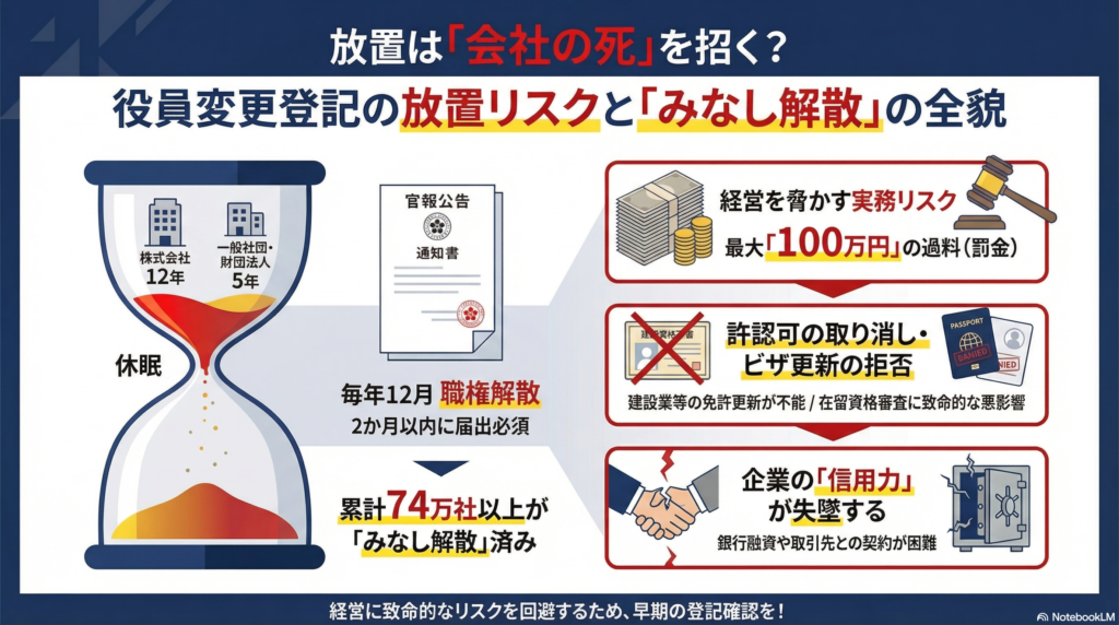 また、在留資格(経営・管理ビザ等)を持つ経営者の場合、登記放置は「会社の実体がない」と判断される決定的な要因となります。
